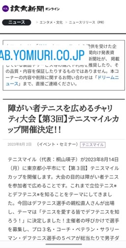 【第3回】テニスマイルカップが読売新聞オンラインに掲載されました。
