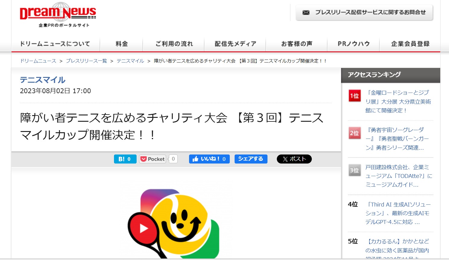 メディア 【メディア掲載】Dreamニュースに掲載されました teatime 2025年3月2日 【第3回】テニスマイルカップがDreamニュースに掲載されました。 https://www.dreamnews.jp/press/0000285185/