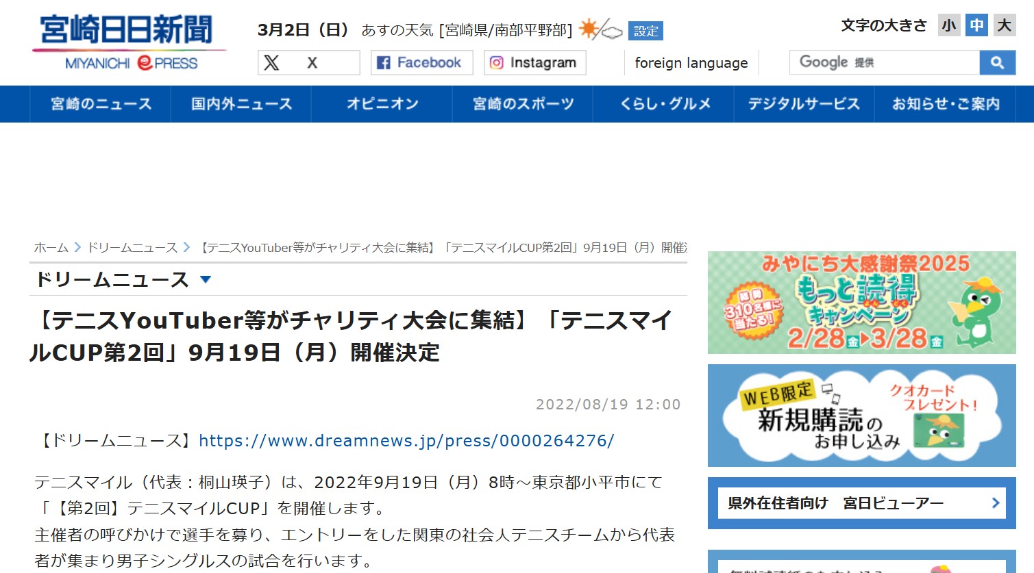 【第2回】テニスマイルカップが宮崎日日新聞に掲載されました。